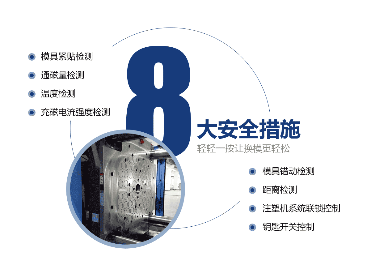 電永磁磁力模板只需一名操作員,無需其他工具,就可以在距注塑機安全距離的磁力系統(tǒng)上執(zhí)行操作。 大大降低人工成本和勞動強度。
